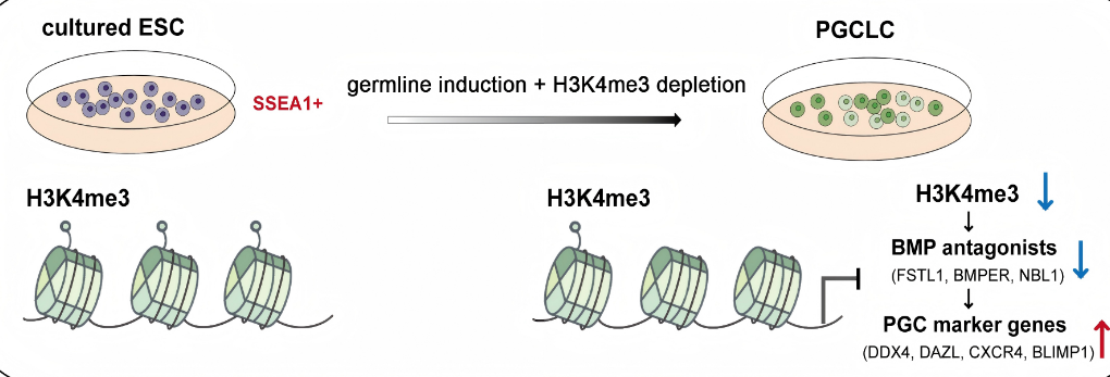 另外,课题组还研发了高效获取鸡生殖细胞的新技术。鸡内源生殖细胞数量较少且难以分离培养,而生殖细胞可通过多能性胚盘细胞诱导生成,但目前诱导效率较低。为此,课题组对鸡多能胚盘细胞向原始生殖细胞分化过程中的关键组蛋白修饰和染色质状态变化进行了系统比较,揭示了特定的染色质状态变化能有效调控生殖系基因的表达,促进生殖细胞谱系的特化;通过选择性擦除表观遗传H3K4me3组蛋白修饰则可以阻断BMP信号拮抗剂的表达,从而增强原始生殖样细胞的生成。